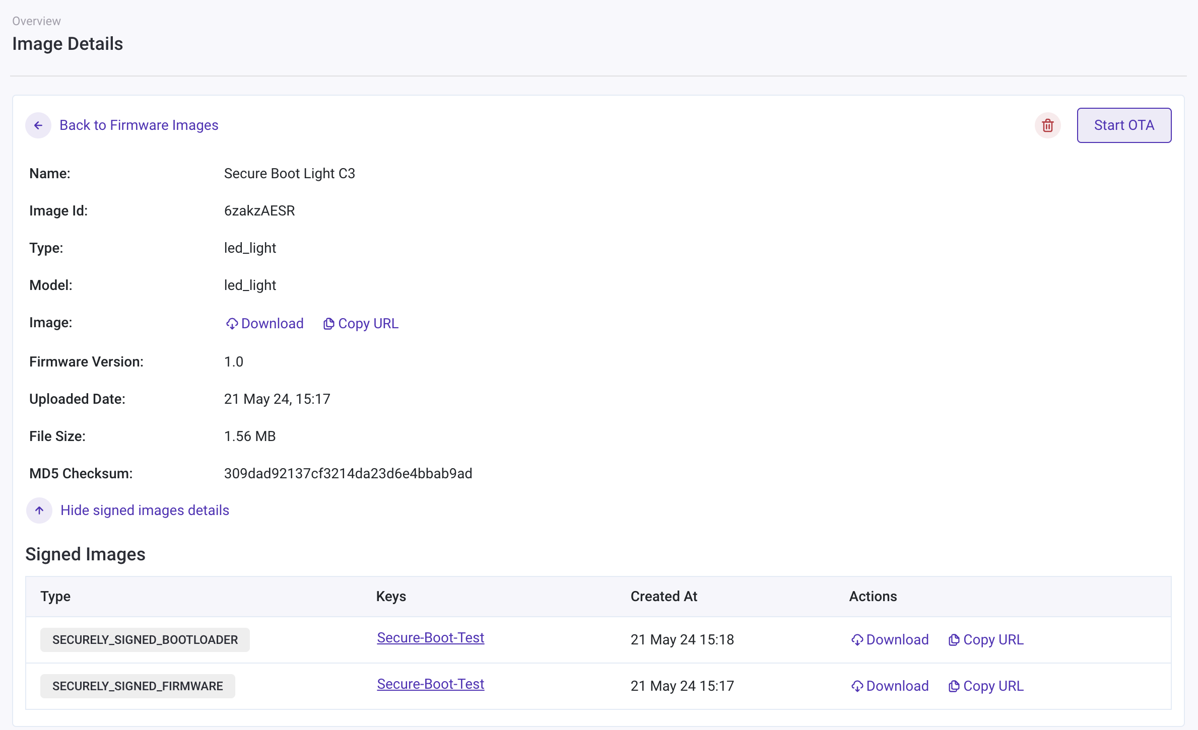 Choose the correct option based on your use case and start the OTA. Under the OTA details page, you can see Secure boot: yes and also view signed image details. It will also indicate auto select key if applicable.