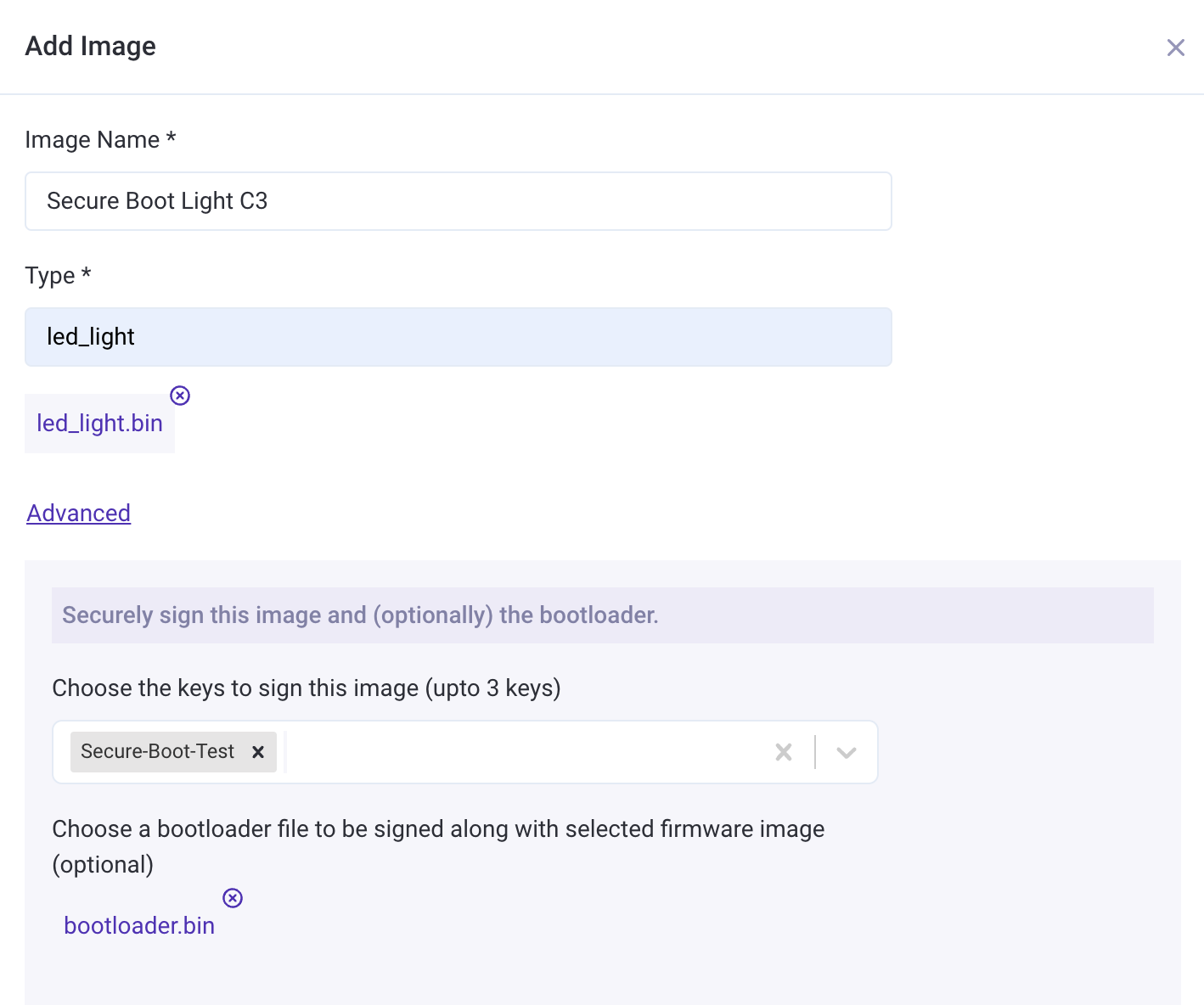Select the bootloader image (required only while enabling secure boot, not for subsequent OTA jobs)