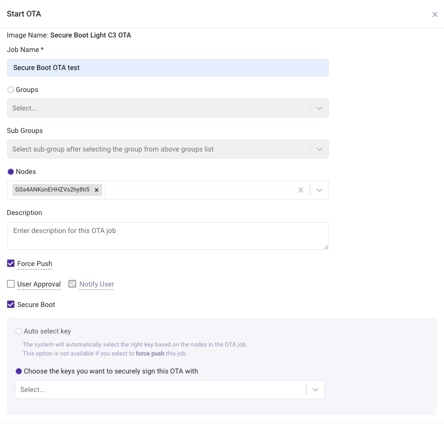 For OTA Upgrades, the firmware image should be built as per the instructions above, but these can be uploaded without selecting a signing key. Once uploaded, click on the "Start OTA" button on the right in the Firmware Images list. In the popup, give OTA Job name, select the Node/Group and select the "Secure Boot" checkbox.